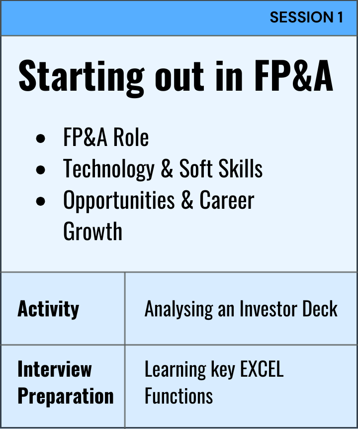 Gain the essential skills to become a confident FP&A Analyst and take the first step toward landing your ideal job in financial planning and analysis. Through instructor-led sessions, a curriculum based on industry best practices, and hands-on practical exercises, you’ll build a solid foundation in FP&A and develop the expertise needed to succeed in your entry-level role.